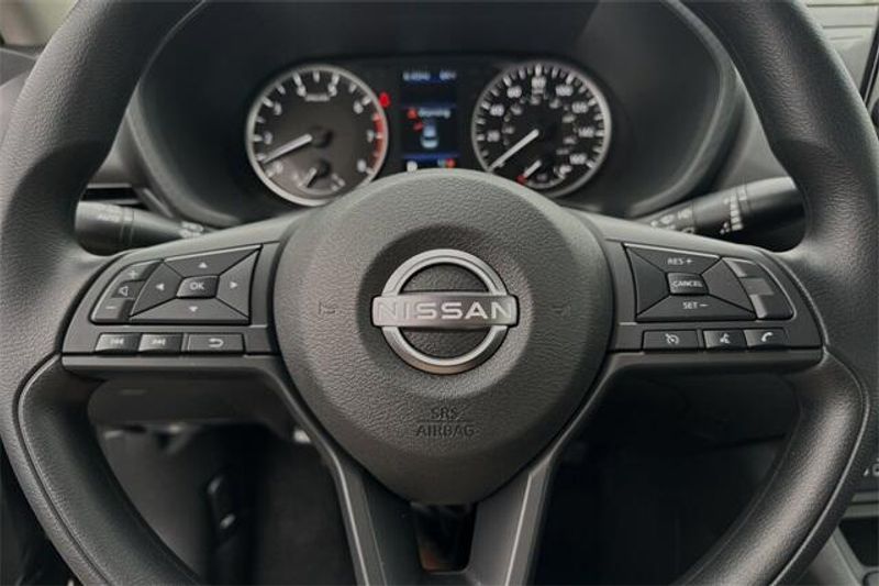 CVT with Xtronic, Charcoal Cloth, 4 Speakers, ABS brakes, Air Conditioning, AM/FM radio, Auto High-beam Headlights, Blind Spot Warning, Body Colored Splash Guards (4-Piece), Brake assist, Bumpers: body-color, Carpeted Floor Mats with Trunk Mat, Clear Rear Bumper Protector, Cloth Seat Trim, Delay-off headlights, Driver door bin, Driver vanity mirror, Dual front impact airbags, Dual front side impact airbags, Electronic Stability Control, Four wheel independent suspension, Front anti-roll bar, Front Bucket Seats, Front Center Armrest, Front reading lights, Fully automatic headlights, Illuminated entry, Knee airbag, Low tire pressure warning, NissanConnect featuring Apple CarPlay and Android Auto, Occupant sensing airbag, Outside temperature display, Overhead airbag, Overhead console, Panic alarm, Passenger door bin, Passenger vanity mirror, Power door mirrors, Power steering, Power windows, Radio data system, Radio: AM/FM with RDS/MP3/Aux-in, Rear anti-roll bar, Rear Parking Sensors, Rear side impact airbag, Rear window defroster, Remote keyless entry, Speed control, Speed-sensing steering, Split folding rear seat, Steering wheel mounted audio controls, Tachometer, Telescoping steering wheel, Tilt steering wheel, Traction control, Trip computer, Variably intermittent wipers, and Wheels: 16'' Steel with Full Covers. 30/40 City/Highway MPG