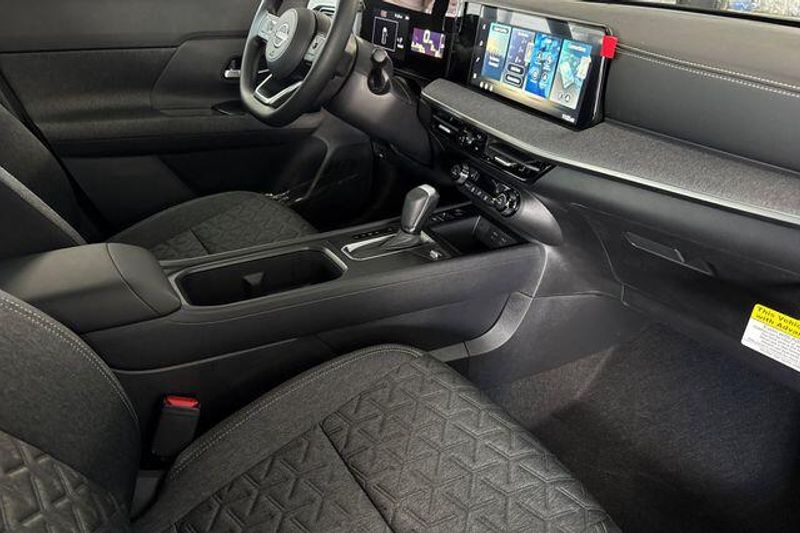 Charging Package (USB Charging Cable Set - Nissan and USB-C Power Delivery), Cold Weather Package (Heated Front Seats, Heated Mirrors, and Rear Floor Heater Ducts), 4 Speakers, 4-Wheel Disc Brakes, ABS brakes, Air Conditioning, AM/FM radio, Auto High-beam Headlights, Automatic temperature control, Blind Spot Warning, Brake assist, Bumpers: body-color, Carpeted Floor Mats and Underfloor Protector, Cloth Seat Trim, Crossbars, Driver door bin, Driver vanity mirror, Dual front impact airbags, Dual front side impact airbags, Electronic Stability Control, Emergency communication system, Exterior Parking Camera Rear, Front anti-roll bar, Front Bucket Seats, Front Center Armrest, Front reading lights, Front wheel independent suspension, Fully automatic headlights, Illuminated entry, Knee airbag, Low tire pressure warning, NissanConnect featuring Apple CarPlay and Android Auto, Occupant sensing airbag, Outside temperature display, Overhead airbag, Panic alarm, Passenger door bin, Passenger vanity mirror, Power door mirrors, Power steering, Power windows, Radio data system, Radio: AM/FM/SiriusXM Audio System, Rear anti-roll bar, Rear reading lights, Rear side impact airbag, Rear window defroster, Rear window wiper, Remote keyless entry, Security system, Speed control, Speed-sensing steering, Splash Guards, Split folding rear seat, Spoiler, Sport steering wheel, Steering wheel mounted audio controls, Tachometer, Telescoping steering wheel, Tilt steering wheel, Traction control, Trip computer, Variably intermittent wipers, and Wheels: 17'' Steel Flex with Full Covers. 28/35 City/Highway MPG